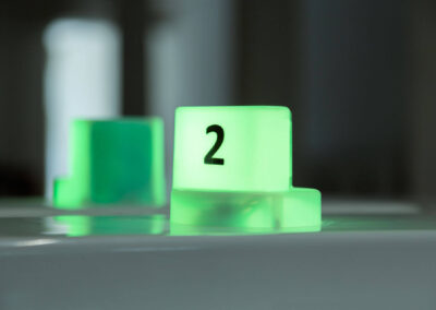 Il quadro di gestione del posto cura è costituito da una scheda a microprocessore con display alfanumerico (16 caratteri per 2 righe area visibile 99×24), una tastiera a membrana con quattro tasti e un comando magnetico per l’abilitazione manuale del tipo e del tempo di cura. Il display mostra lo stato di funzionamento del posto cura e, durante l’esecuzione della terapia, il tempo residuo. Ogni posto cura è collegato ad una scheda LED, alloggiata in un segnalatore numerato, che assume diverse colorazioni in base allo stato di funzionamento del posto cura: libero, prenotato, occupato, lavaggio, sanificazione.