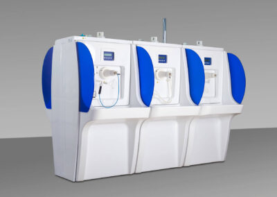 Ogni posto cura ha un lavabo, dove vengono raccolti gli sgocciolamenti di acqua termale conseguenti all’erogazione della terapia. Il lavaggio del lavabo viene effettuato attraverso tre ugelli con acqua potabile di rete (tubazione realizzata in PP) e gestito automaticamente, tramite elettrovalvole (una per ogni posto cura), ad intervalli prefissati durante e a fine cura oppure è attivabile manualmente dallo stesso paziente mediante pulsante di erogazione.