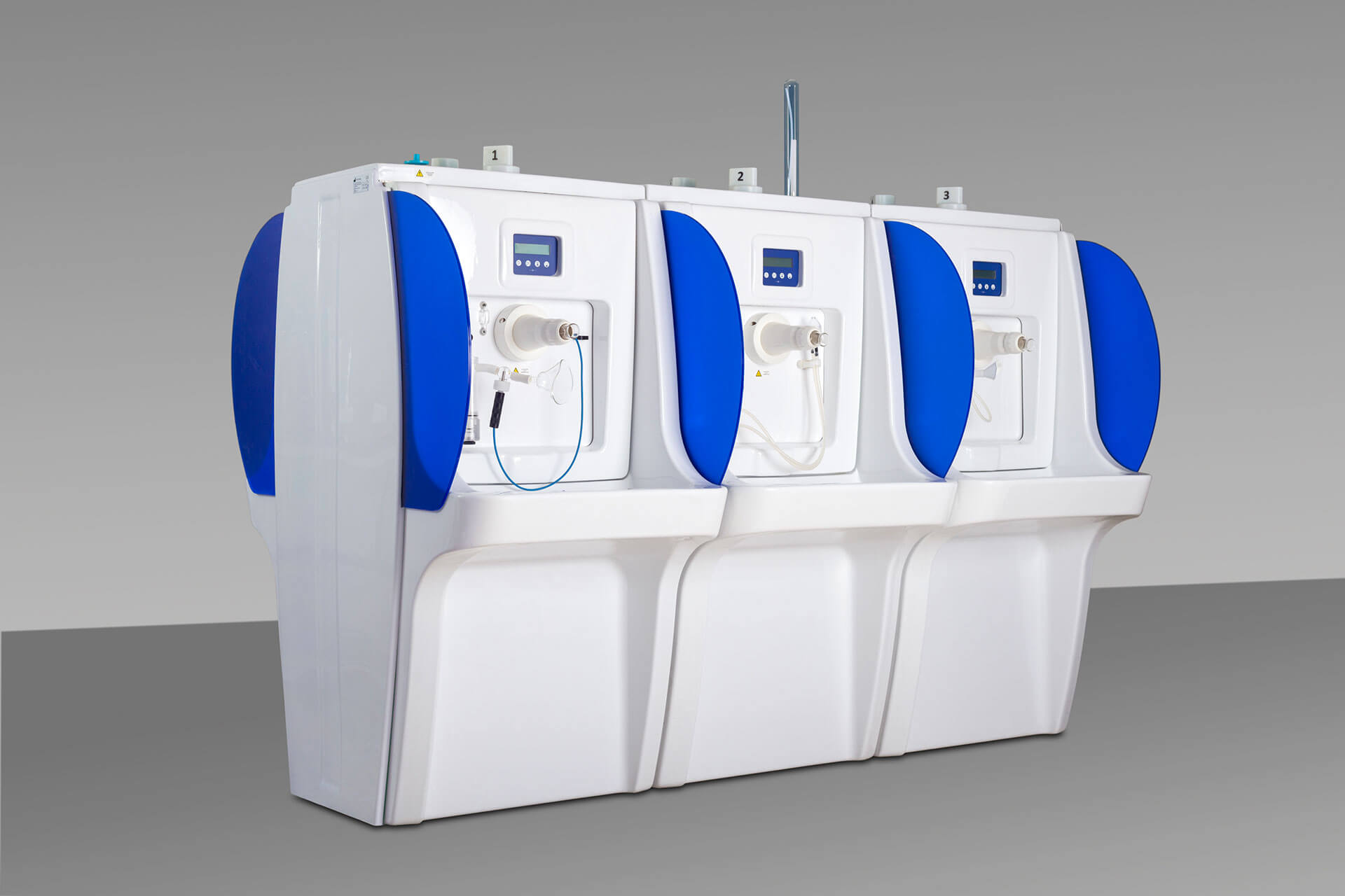 Il posto cura è completo di vaso contenitore in policarbonato idoneo alla sanificazione e dotato di elettrovalvola di scarico automatico, gorgogliatore per la dissociazione del gas dall’acqua termale, terminale di utilizzo orientabile e tubo di collegamento vaso-mascherina in silicone.